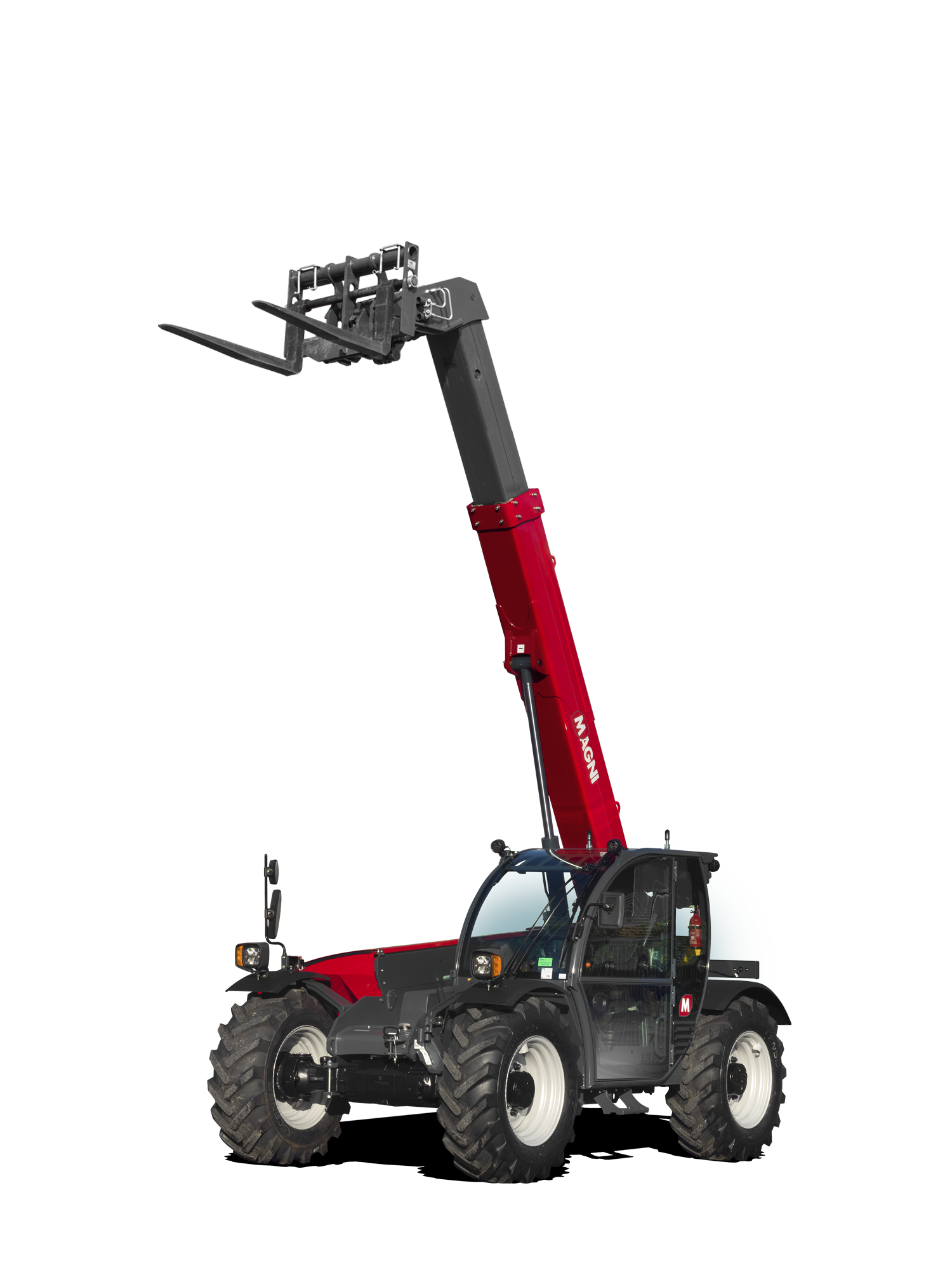 The cab provides what Magni describes as class-leading interior space, while the Load Moment Indicator (LMI) safety system provides continuous load capacity monitoring. Front and rear LED headlights are fitted as standard, and the machines are equipped with dedicated off-road tyres.
